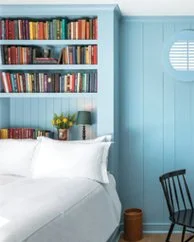 ”[The Carriage Room] is the most charming, with its walls all painted blue and bookshelves framing the bed.”